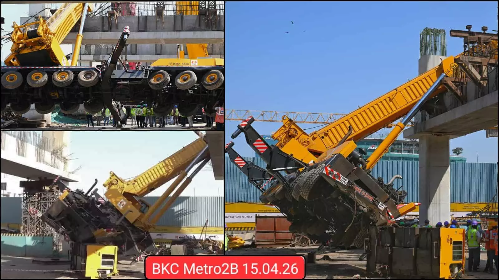 मुंबई के बीकेसी में मेट्रो लाइन 2B के आईएलएंडएफएस स्टेशन के पास पलटी हुई विशालकाय क्रेन