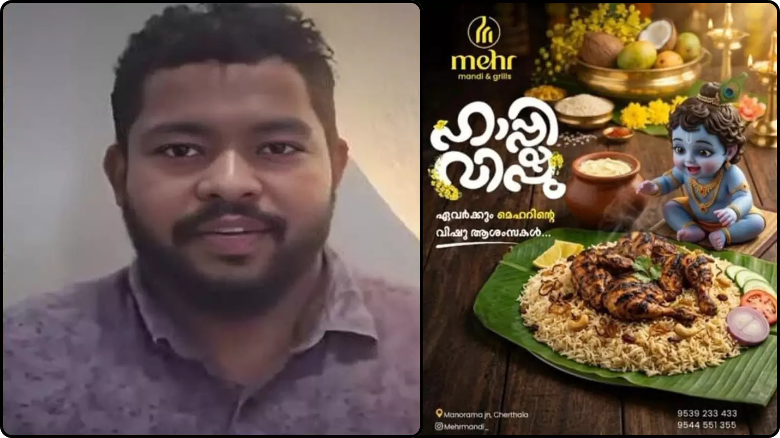 चेरथला स्थित ‘मेहर मंडी एंड ग्रिल्स’ नामक होटल समूह ने विषु के अवसर पर एक विज्ञापन जारी किया, जिसमें भगवान कृष्ण की छवि को एक नॉन-वेज डिश, विशेष रूप से चिकन के साथ प्रस्तुत किया गया। यह विज्ञापन सोशल मीडिया पर तेजी से वायरल हुआ और देखते ही देखते लोगों के बीच असंतोष का कारण बन गया। गौरतलब है कि विषु केरल में मनाया जाने वाला मलयाली नववर्ष है, जो सूर्य के मेष राशि में प्रवेश के साथ मनाया जाता है और इसे अत्यंत पवित्र तथा शुभ दिन माना जाता है।