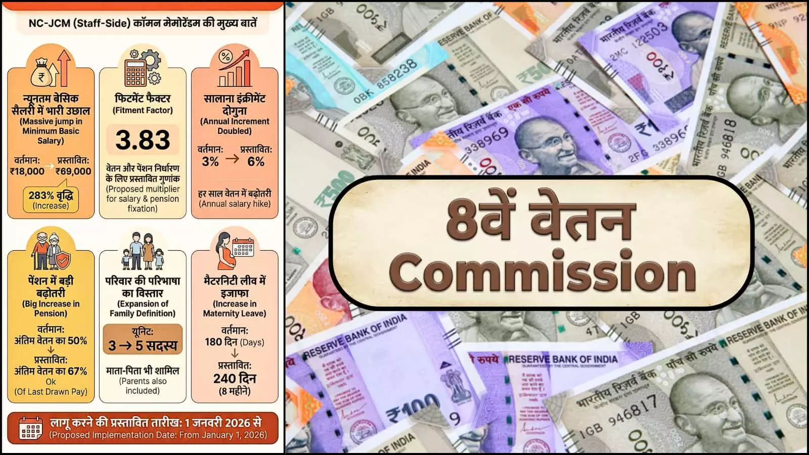 8th Pay Commission NC-JCM memorandum 2026 : भारत के 50 लाख से अधिक केंद्रीय कर्मचारियों और 68 लाख पेंशनभोगियों के लिए एक ऐसा अध्याय शुरू होने जा रहा है, जो उनके भविष्य की आर्थिक तस्वीर को पूरी तरह बदल सकता है। नेशनल काउंसिल (JCM) की स्टाफ साइड ने 8वें वेतन आयोग को अपना आधिकारिक साझा ज्ञापन (Common Memorandum) सौंप दिया है, जिसमें वेतन वृद्धि और सुविधाओं को लेकर अब तक की सबसे क्रांतिकारी मांगें रखी गई हैं। इस मेमोरेंडम की सबसे सनसनीखेज सिफारिश न्यूनतम मूल वेतन (Basic Pay) को वर्तमान के ₹18,000 से सीधे 283 प्रतिशत बढ़ाकर ₹69,000 करने की है। यदि केंद्र सरकार इन प्रस्तावों पर अपनी मुहर लगाती है, तो यह आजादी के बाद का सबसे बड़ा वेतन संशोधन साबित होगा, जो सरकारी सेवा के प्रति आकर्षण और कर्मचारियों के जीवन स्तर को नई ऊंचाइयों पर ले जाएगा।